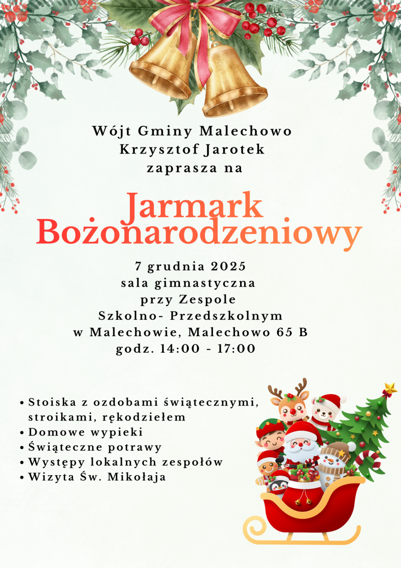 Już w niedzielę, 7 grudnia br. odbędzie się Jarmark Bożonarodzeniowy w sali sportowej Zespołu Szkolno-Przedszkolnego w Malechowie.